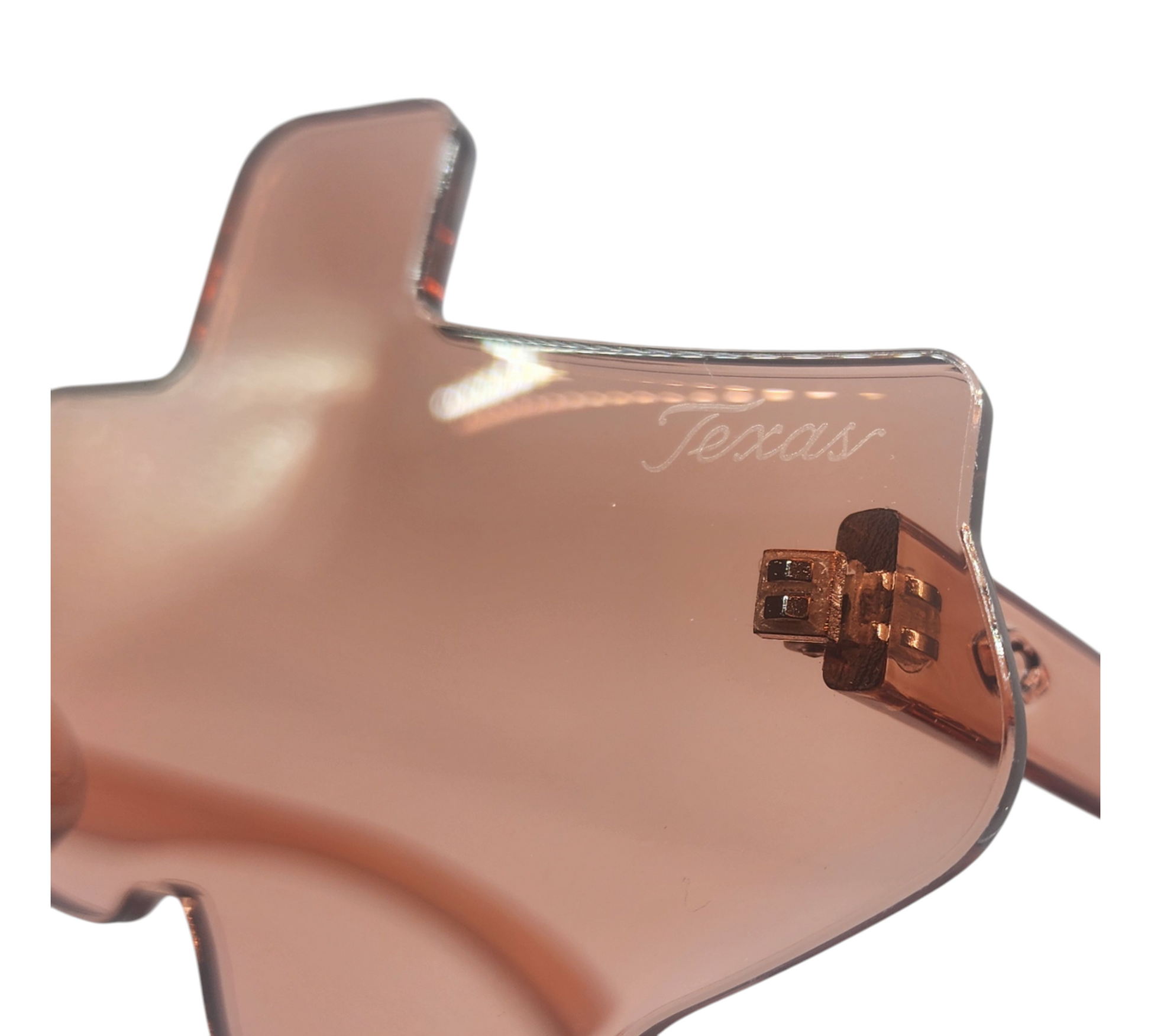 Texas shaped sunglasses with golden brown lenses and translucent golden brown side stems. The word "Texas" is engraved on the upper-right lens, adding a sophisticated finishing touch to these distinct high-quality sunglasses.