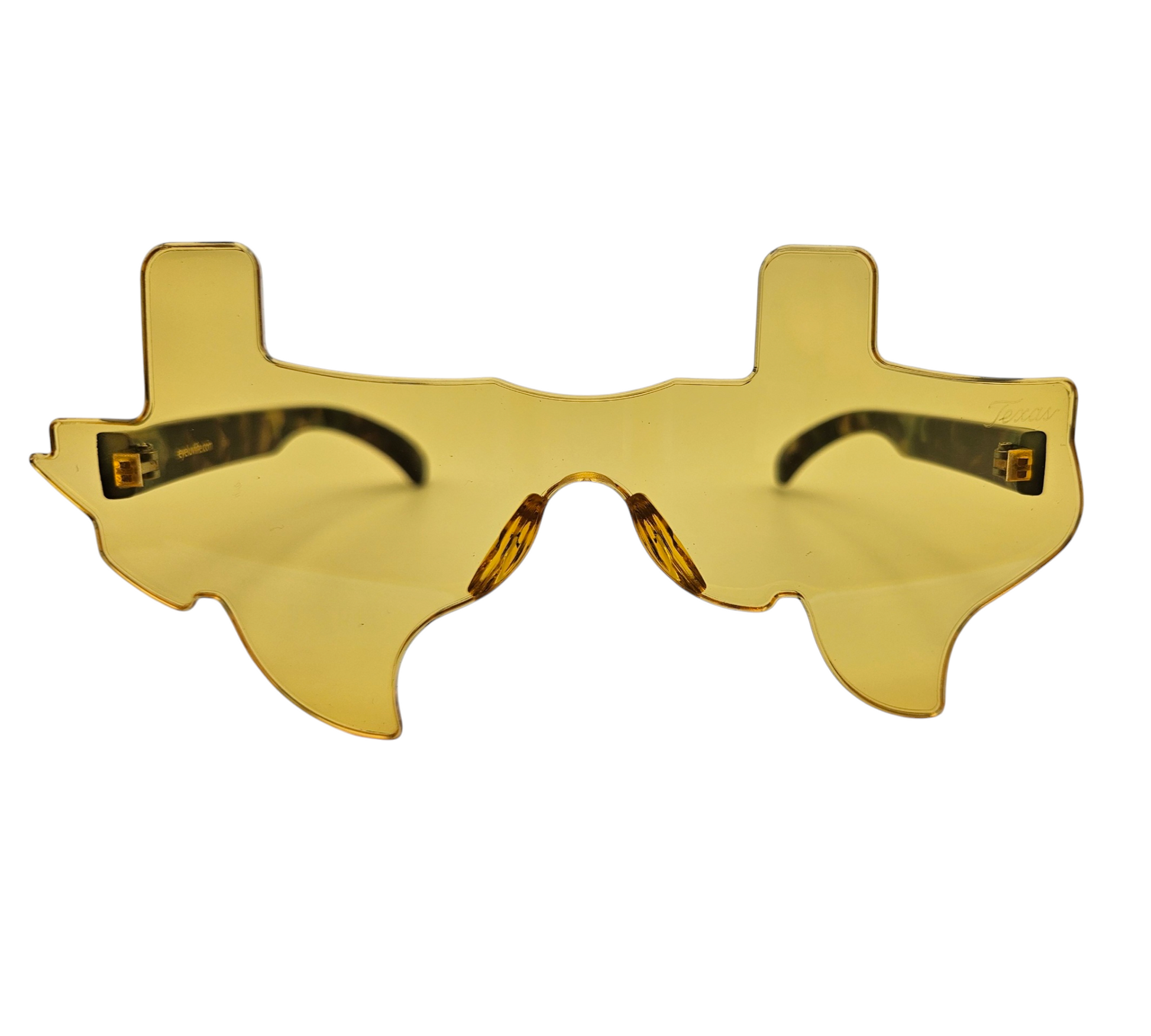 Texas shaped sunglasses with yellow lenses and translucent forest camo side stems. The word "Texas" is engraved on the upper-right lens, adding a sophisticated finishing touch to these distinct high-quality sunglasses.
